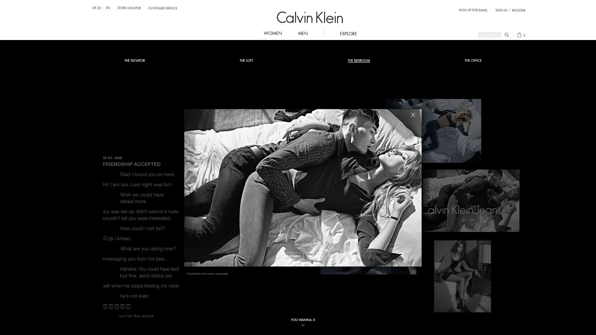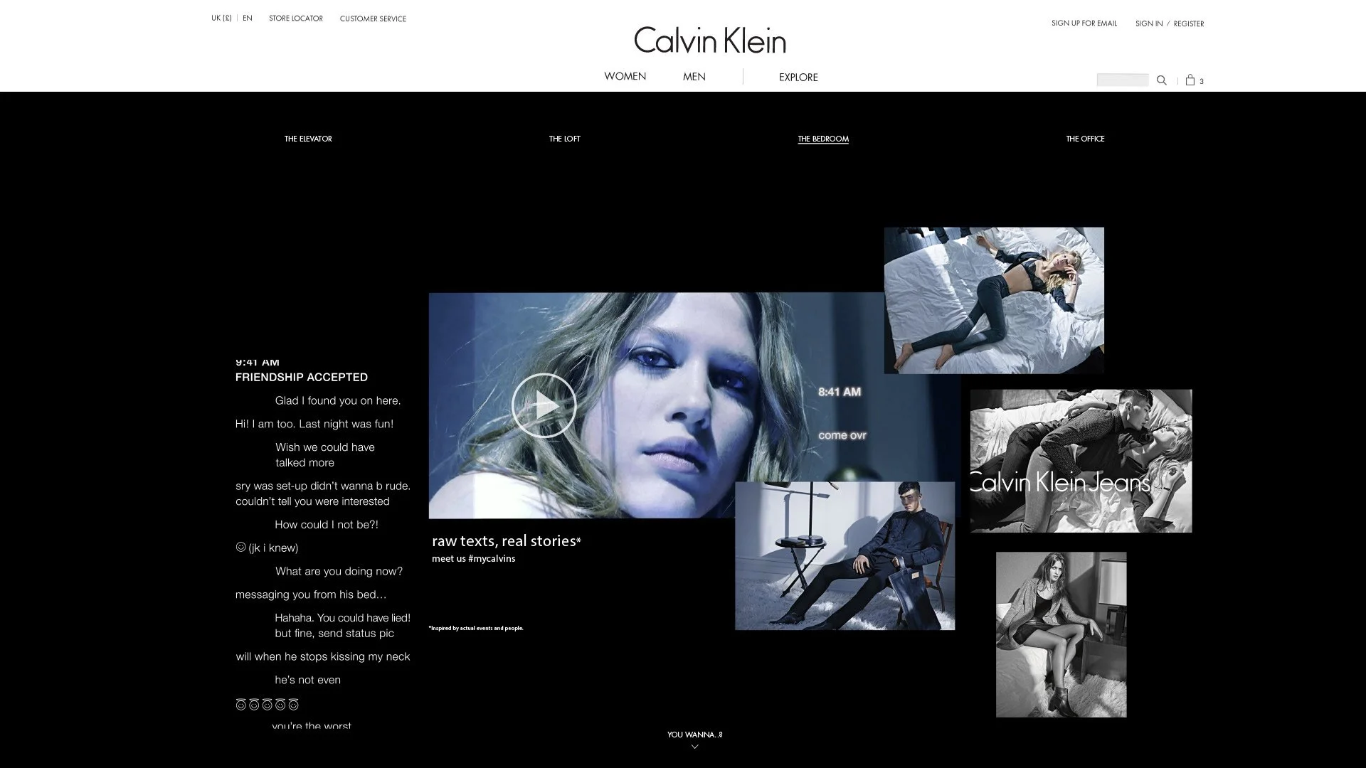 ‘Raw text, Real stories’ was the FW campaign. Inspired by actual events and real people the campaign explored love and lust in the digital age. I developed the digital concept and designed the campaign site that featured 4 virtual worlds, which users could voyeuristically explore. Users could uncover the lives of our protagonists, by flicking through images, reading salacious text messages and watching snippets of video footage. As a result this digital concept was used for global purpose.